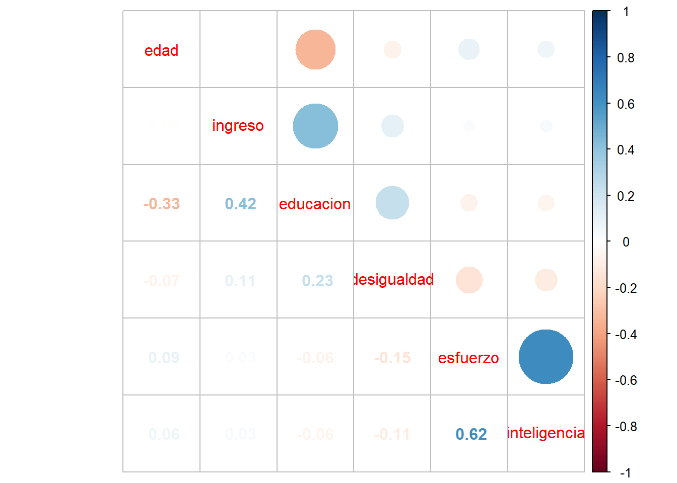 - Cada coeficiente expresa la correlación de una variable con otra. Por ejemplo, la correlación entre la variable de `educación` e `ingreso` es 0.415.