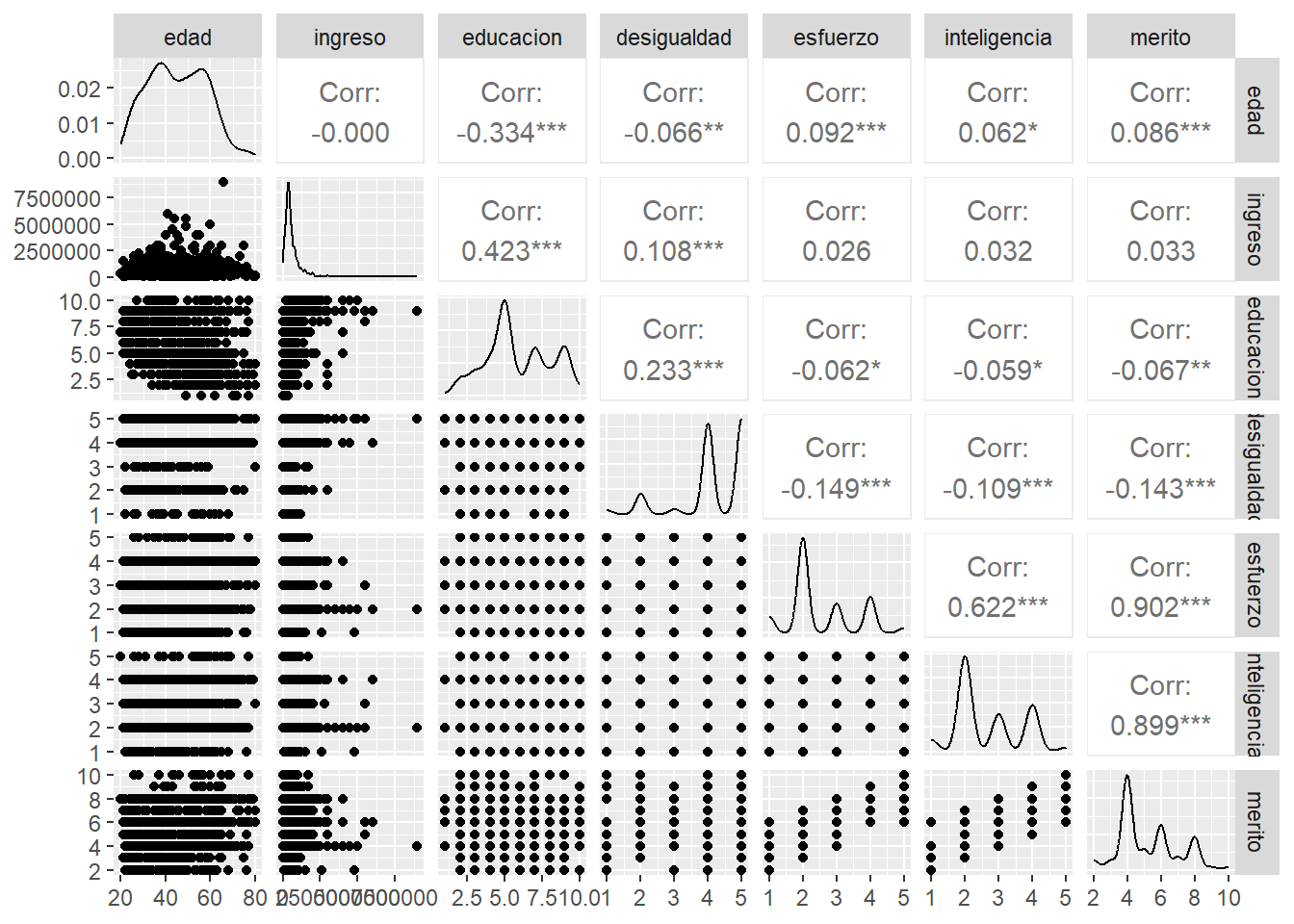 Para este ejemplo, vamos a utilizar dos variables numéricas (ingresos y edad) y cuatro variables categóricas (Educación, percepción de desigualdad y 2 de percepción de meritocracia).