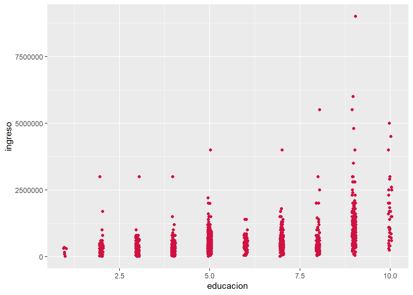 sjPlot::plot_scatter(proc_elsoc, educacion, ingreso)