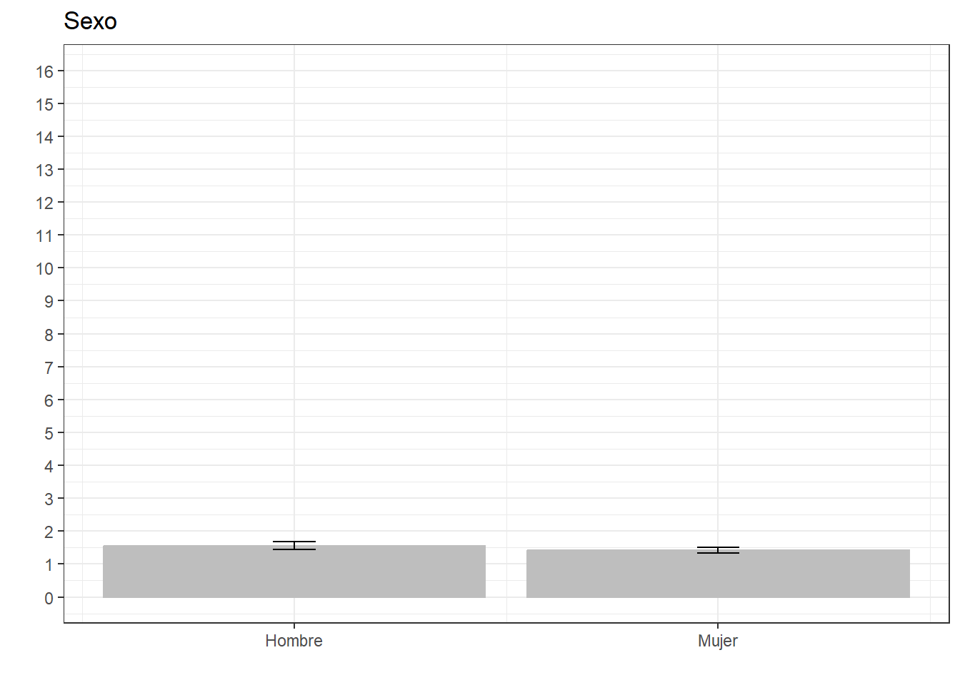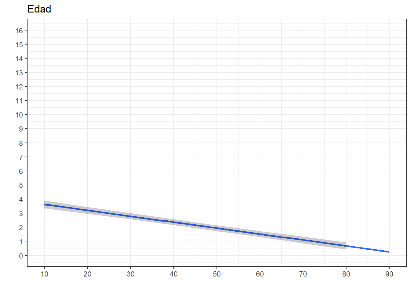 ggeffects::ggpredict(fit07, terms="edad") %>%ggplot(mapping=aes(x = x, y=predicted)) +labs(title="Edad", x ="", y ="")+theme_bw() +geom_smooth()+geom_ribbon(aes(ymin = conf.low, ymax = conf.high), alpha = .2, fill ="black") +scale_x_continuous(breaks =seq(0,100, by =10))+scale_y_continuous(limits =c(0,16), breaks =seq(0,16, by =1))
