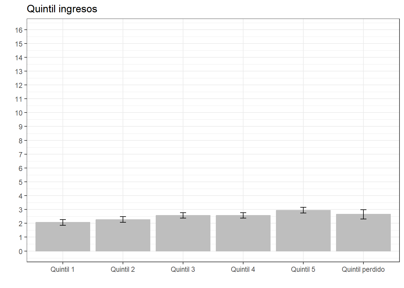 El Modelo 3 indica que en medida que aumenta el ingreso, la participación política tiende a ser más alta. En específico, en comparación con el menor quintil de ingreso, al pertenecer a un quintil de ingreso 2 (p<0.05), 3, 4 y 5 (p<0.001), la participación política aumenta, manteniendo el resto de las variables constantes. Este efecto disminuye un poco en el modelo siguiente, pero mantiene un efecto lineal (a mayor quintil, mayor participación).