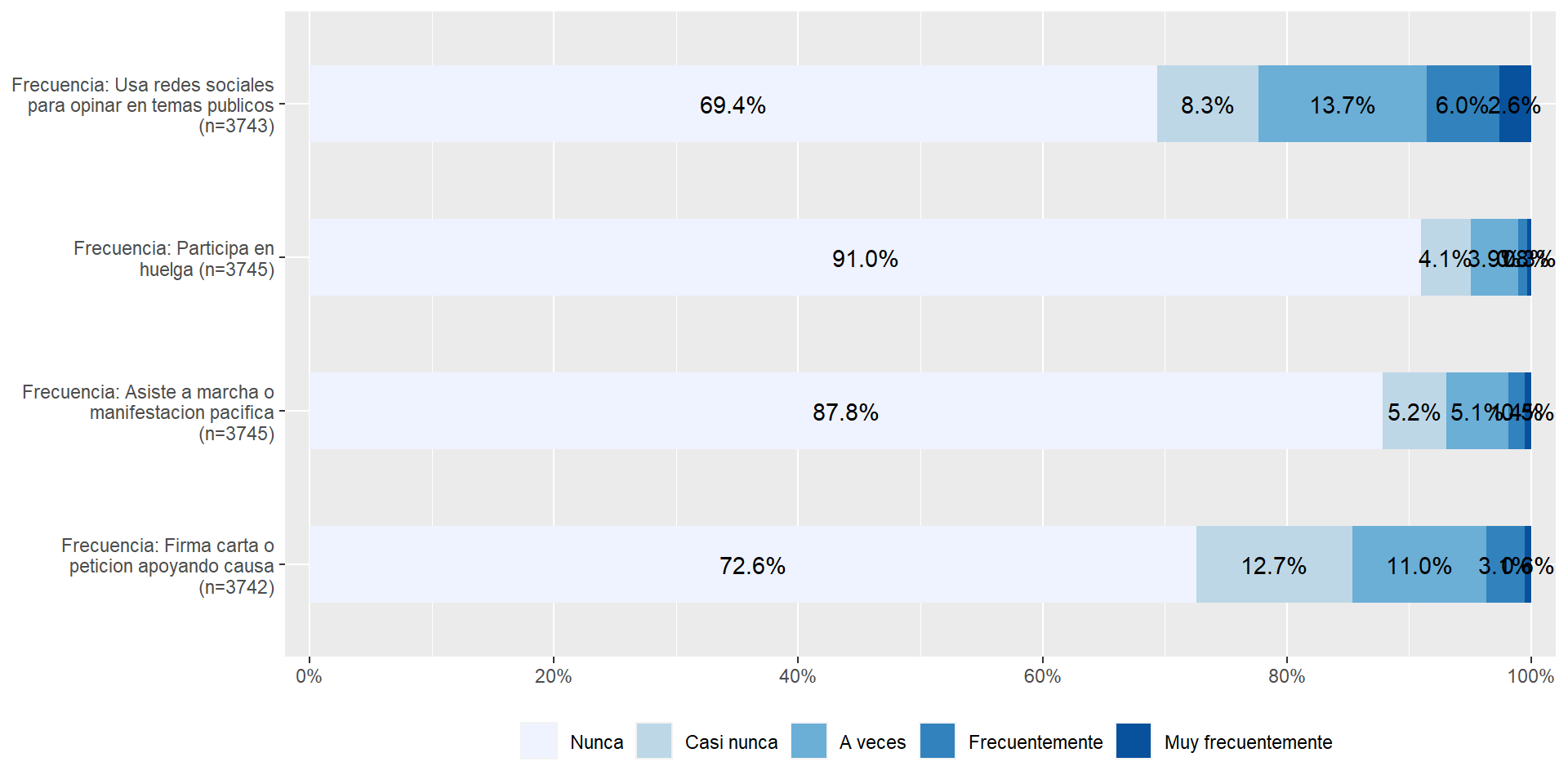 El Estudio Longitudinal Social del Chile ELSOC, único en Chile y América Latina, consiste en encuestar a casi 3.000 chilenos, anualmente, a lo largo de una década. ELSOC ha sido diseñado para evaluar la manera cómo piensan, sienten y se comportan los chilenos en torno a un conjunto de temas referidos al conflicto y la cohesión social en Chile. La población objetivo son hombres y mujeres entre 15 y 75 años de edad con un alcance nacional, donde se obtuvo una muestra final de 3748 casos en el año 2018.